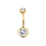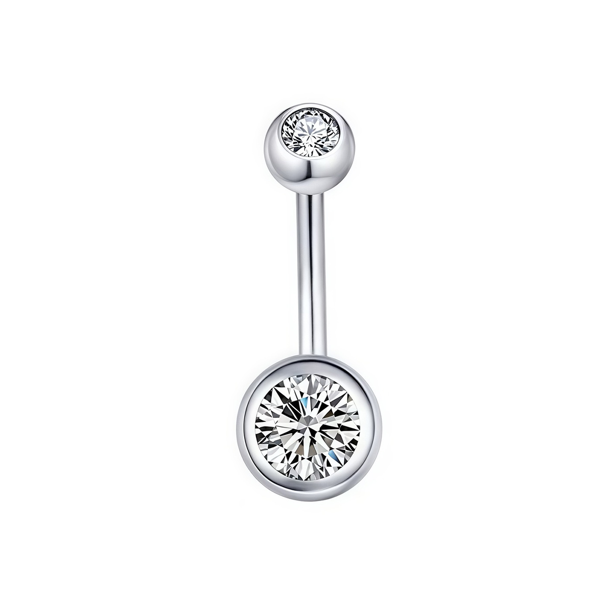 Bauchnabelpiercing aus 304 Edelstahl mit polierter Oberfläche. Das Piercing ist mit zwei klaren Zirkonia-Steinen in geometrischer Fassung ausgestattet. Der Schraubverschluss ermöglicht ein sicheres Einsetzen und festen Halt. Das Material ist nickelfrei, korrosionsbeständig und für den täglichen Gebrauch geeignet. Die glatte, polierte Oberfläche sorgt für angenehmen Tragekomfort.