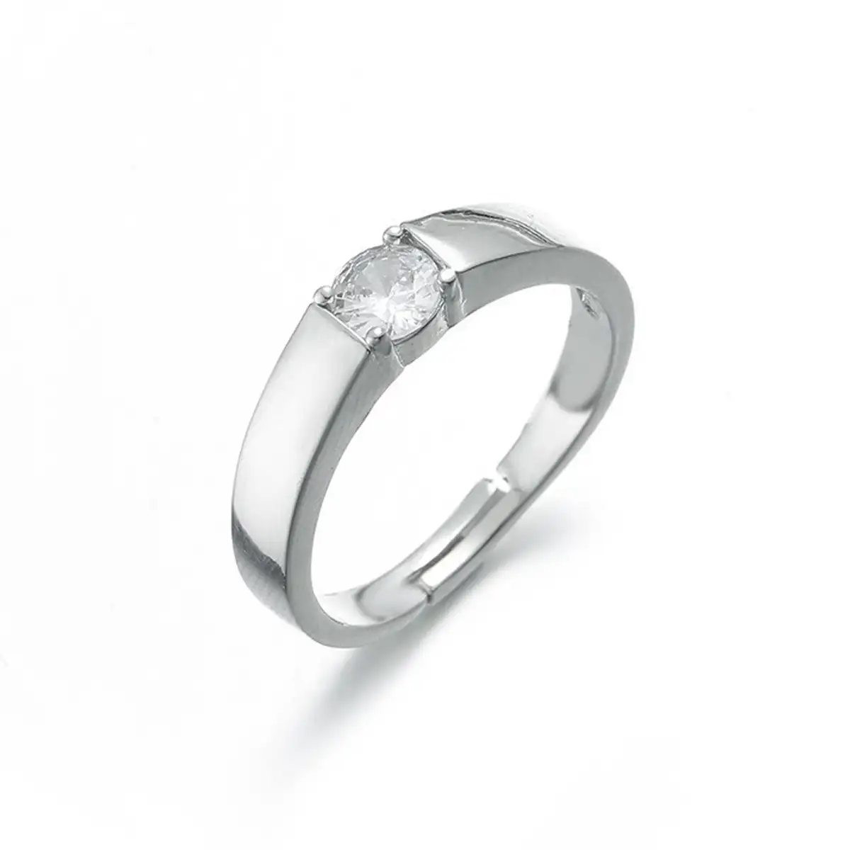 Ring aus Titanstahl in silberfarbener Ausführung. Die Oberfläche ist glatt poliert. In die Ringschiene ist ein klarer Zirkonia-Stein eingesetzt. Geometrisches, schlichtes Design. Der Ring ist formstabil, korrosionsbeständig und für den täglichen Gebrauch geeignet. Geeignet als Modeschmuck.